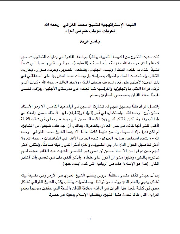 القيمة الإستراتيجية للشيخ محمد الغزالي – رحمه الله أبحاث للقراءة والتحميل من هنا : https://www.jasserauda.net/wp-content/uploads/2025/08/القيمة-الإستراتيجية-للشيخ-الغزالي-معدل.pdf أقرأ المزيد