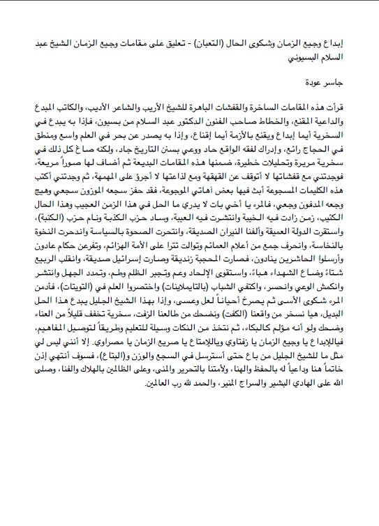 إبداع وجيع الزمان وشكوي الحال (التعبان) – تعليق علي مقامات وجيع الزمان الشيخ عبد السلام البسيوني أبحاث للقراءة والتحميل من هنا : https://www.jasserauda.net/wp-content/uploads/2025/08/تعليق-على-مقامات-الشيخ-عبد-السلام.pdf أقرأ المزيد